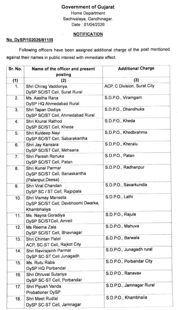 ગૃહ વિભાગના જાહેરનામા મુજબ, આ ફેરબદલી તાત્કાલિક અસરથી અમલમાં મુકવામાં આવી છે. આમાં મુખ્યત્વે DySP અને પોલીસ ઇન્સ્પેક્ટર કક્ષાના અધિકારીઓ સામેલ છે. આ અધિકારીઓને હવે તેમના હાલના પદ ઉપરાંત નવી જવાબદારીઓ પણ સોંપાઈ છે.