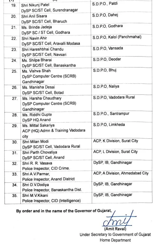 આ યાદીમાં સુરત, અમદાવાદ ગ્રામ્ય, ખેડા, સાબરકાંઠા, મહેસાણા અને અમરેલી સહિતના અનેક જિલ્લાઓના અધિકારીઓનો સમાવેશ થાય છે.