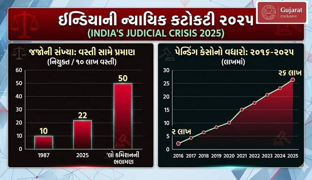 તુલના કરો તો જ્યાં જજ-જનસંખ્યા પ્રમાણમાં 2014ના 17.48થી વધીને 2025માં 22 થયો, ત્યાં પેન્ડિંગ કેસ 2016ના 2,20,736થી વધીને 2025માં 26,85,836 થઈ ગયા.