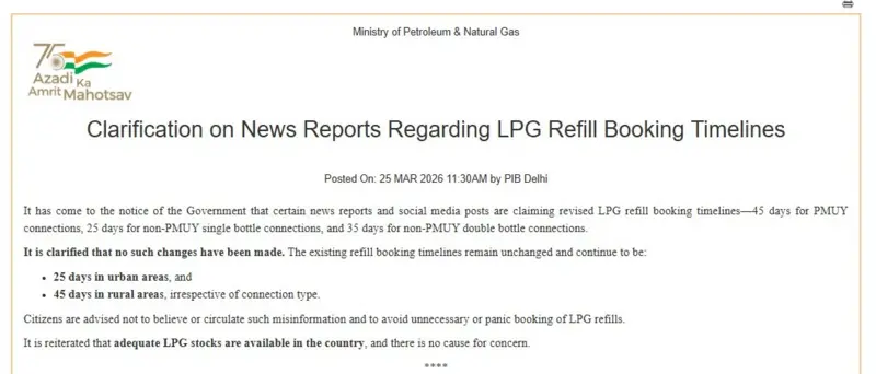 પેટ્રોલિયમ અને પ્રાકૃતિક ગેસ મંત્રાલયે એલપીજી રિફિલની બુકિંગ ટાઈમલાઈનને લઈને સોશિયલ મીડિયા પર કરવામાં આવી રહેલા નવા દાવાઓને ફગાવી દીધા છે.